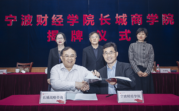 在张景安、刘昱、孙惠敏的共同见证下,王云儿、王德禄代表双方签订了共建宁波财经学院长城商学院合作协议书。根据协议,长城商学院将由我校与长城战略咨询双方共建共管,实行理事会领导下的院长负责制,理事会是学院领导和决策机构,执行院长负责学院运营与管理。双方将共同制定专业人才培养方案及教学实施方案,共同组建学院师资队伍,共同推进专业课程建设,共享相关课程资源,共同协商制定学生创业实践方案。