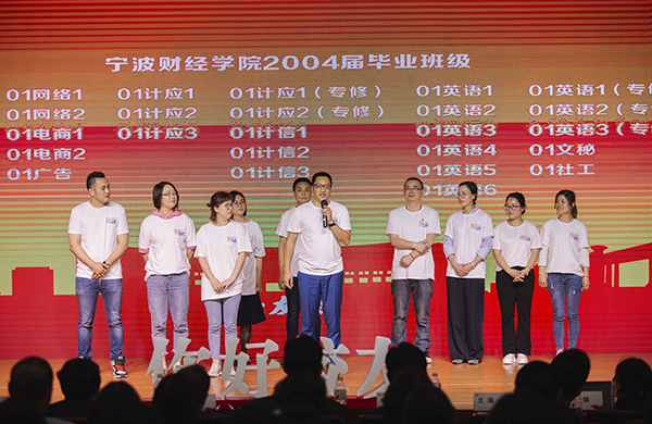 “01财会1班向母校报到!”“01英语1班向母校报到!”“01计应1班向母校报到!”……“向母校报到”环节中,04届各班级校友代表纷纷上台向母校报到、向老师报到。“我祝福母校越办越好,祝愿老师身体健康,祝愿学弟学妹学习进步!”校友们聚拢在王云儿校长身旁,大家欢笑着、感慨着、祝福着,将温馨欢快的现场气氛推向高潮。