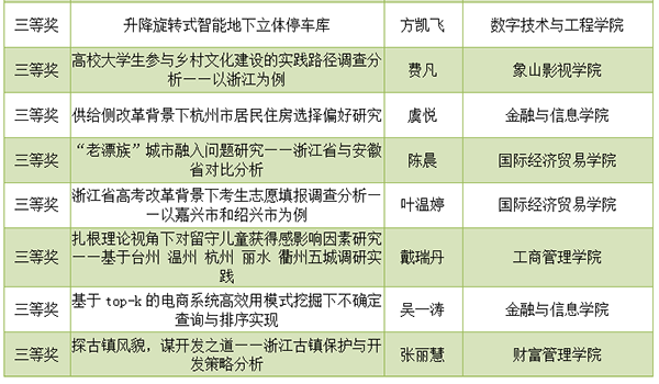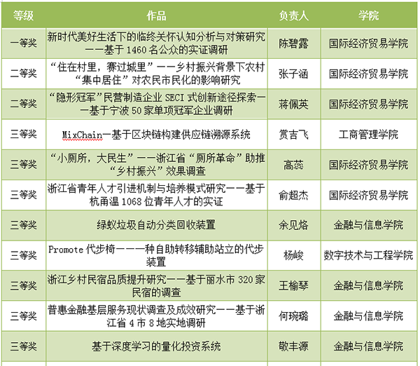 其中,由周莹莹、王乐老师指导,国际经济贸易学院陈碧露等同学完成的作品《新时代美好生活下的临终关怀认知分析与对策研究——基于1460名公众的实证调研》获得一等奖。由徐默莅、王雪姣、叶素文老师指导,国际经济贸易学院张子涵等同学完成的作品《“住在村里,赛过城里”——乡村振兴背景下农村“集中居住”对农民市民化的影响研究》;由沈哲、朱世峰老师指导,国际经济贸易学院蒋佩英等同学完成的作品《“隐形冠军”民营制造企业SECI式创新途径探索——基于宁波50家单项冠军企业调研》分获二等奖。由赵毅斌老师指导,数字技术与工程学院杨峻等同学完成的作品《Promote代步椅——一种自助转移辅助站立的代步装置》;由陈苗青、乔丽萍、王飞老师指导,由数字技术与工程学院何源等同学完成的作品《智能仓储试剂柜》;由张海峰、徐默莅老师指导,金融与信息学院余见烙等同学完成的作品《绿蚁垃圾自动分类回收装置》;由乔丽萍、陈祥老师指导,数字技术与工程学院方凯飞等同学完成的作品《升降旋转式智能地下立体停车库》等17项作品分获三等奖。