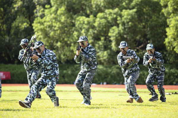 随后,军训教导队进行了军事技能表演,受训学员表演了英姿飒爽的擒敌拳、紧张刺激的实战演练、催人奋进的军歌合唱等,精彩的汇报演出赢得了在场师生的阵阵掌声。
