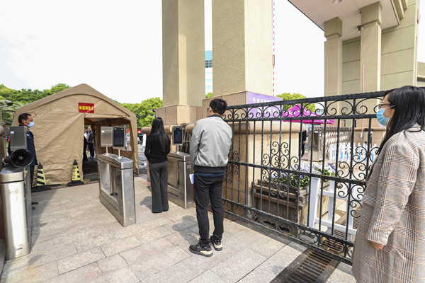 演练现场设置了体温检测、信息核查、应急处置等卡点,王云儿、周波详细了解了各项工作准备情况,叮嘱工作人员思想上要高度重视,决不能麻痹松懈,切实筑牢校园防疫第一道防线。演练中,由辅导员教师扮演的学生及家长到达指定区域后,在工作人员引导下有序间隔排队等候查验,并依次接受红外线测温仪的监测。体温正常人员顺利入校,“异常”人员进入隔离、复测环节,应急医疗小组迅速启动应急工作预案。演练活动全程紧张有序,各部门分工明确、配合紧密、效果明显。