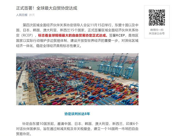 第四次区域全面经济伙伴关系协定领导人会议11月15日举行,东盟十国以及中国、日本、韩国、澳大利亚、新西兰15个国家,正式签署区域全面经济伙伴关系协定(RCEP),标志着全球规模最大的自由贸易协定正式达成。签署RCEP,是地区国家以实际行动维护多边贸易体制、建设开放型世界经济的重要一步,对深化区域经济一体化、稳定全球经济具有标志性意义。