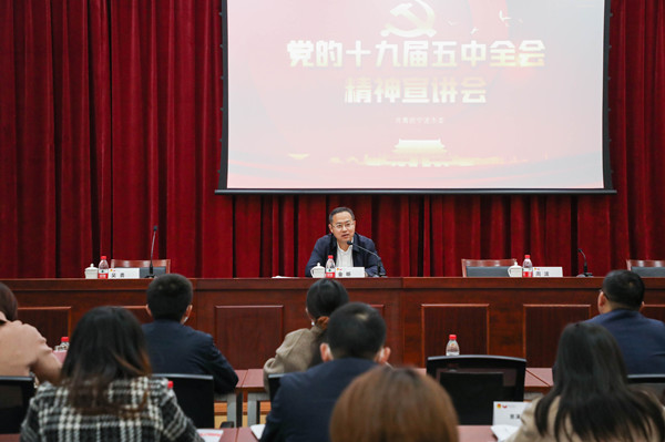 金昕向与会人员宣讲了党的十九届五中全会精神。他围绕“十三五”时期取得的新成就、战略机遇期的新特征、怎样理解未来发展新的目标和“十四五”时期的新任务四个方面与大家进行了交流,并要求各级团干部要反复读原文、抓住关键点,准确理解“十四五”规划的深刻内涵和科学论断,从更深层次领会习近平新时代中国特色社会主义思想,更加自觉地增强“四个意识”、坚定“四个自信”、做到“两个维护”;要深入思考全面建设社会主义现代化国家新征程中青年一代的历史责任和团组织的职责使命,找准工作的有效结合点和关键着力点;要组织动员青年将个人所长与国家所需紧密结合,积极投身实施“十四五”规划和二〇三五年远景目标。