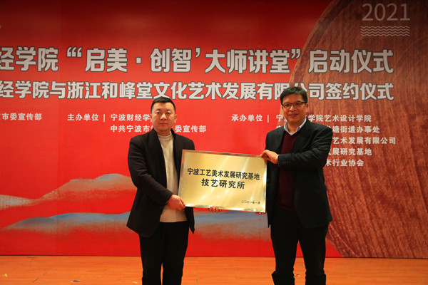 仪式上还举行了校企合作协议签字及授牌活动。“宁波工艺美术发展研究基地技艺研究所”、“和峰堂大师工作坊”的牌匾见证了校企双方的精诚合作。在与会领导和师生们的见证下,高公博、王家锋、周力等国家、省、市工艺美术大师被学校聘为专家顾问、特聘教授。魏祖民宣布我校“‘启美·创智’大师讲堂”正式启动!现场响起了热烈掌声。