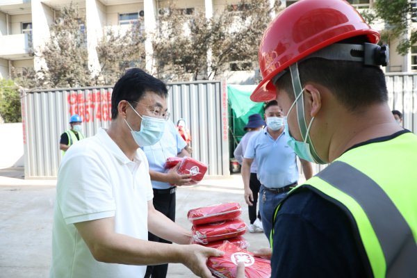 在北区教学区、生活区等单体工程施工现场,王云儿看望慰问了高温下坚守一线的施工作业人员,代表学校对监理单位、施工单位的工作人员表示衷心感谢,为他们送上了防暑降温慰问品。他希望相关部门及时协调解决好施工过程中出现的困难与问题,切实采取有效措施,确保校园改建项目平稳有序推进。他向相关部门负责同志详细询问了改建项目施工进展、质量监控等方面状况,并认真检查了安全生产、疫情防控等方面工作落实情况。