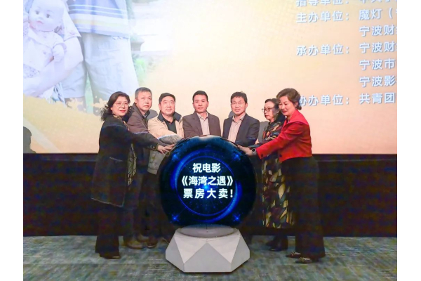 宁波市委宣传部副部长胡文飞(中),宁波市外办一级调研员陈国苗(左三),宁波财经学院理事长、校长王云儿(右三)、宁波市电影家协会主席郑开颜(左一),宁波市电视艺术家协会副主席陈三俊(右二),魔灯影业有限公司总经理李丹萍(右一)、影片导演高建国(左二)等影视公司、影视产业园的领导嘉宾出席了本次首映礼