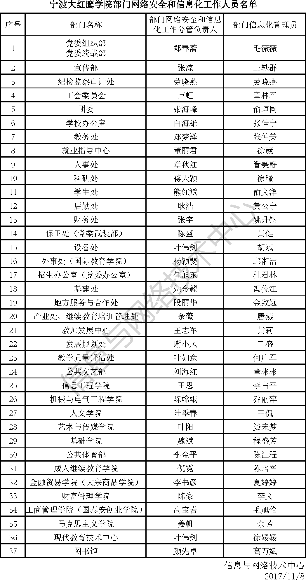 为进一步推进学校网络安全和信息化工作,根据《宁波大红鹰学院信息化工作管理办法》,汇总前期各部门人员上报的情况,现将部门信息化工作人员名单予以公布,如有问题,请联系88052200 刘庆瑜。
