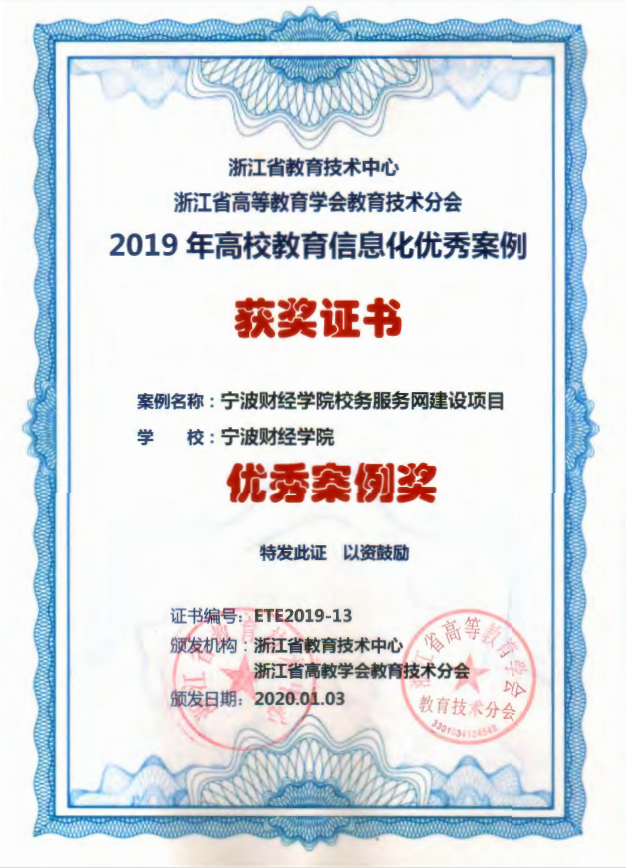 2020年1月3日,2019年浙江省高校教育信息化优秀案例评比活动结果揭晓,我校《宁波财经学院校务服务网》案例喜获2019年度高校教育信息化优秀案例奖。