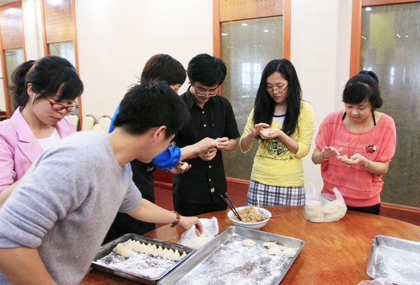 本次活动约有40名来自学校各部门的单身青年教师参加。活动分为二部分:首先是在学校第八食堂分组进行了包饺子和水果拼盘比赛,通过“最有型的饺子”、“最有效率的小组”、“最有艺术感拼盘”、“最有人气拼盘”的评比,将整个活动推向了高潮。当大家品尝着自己亲手制作的劳动成果,尤其是通过团队协作取得的成绩,喜悦之情无以言表。接着,老师们又在高职学院多功能厅开展了“泡泡糖”、“ 你画我猜”、 “一百秒不NG”等趣味活动。