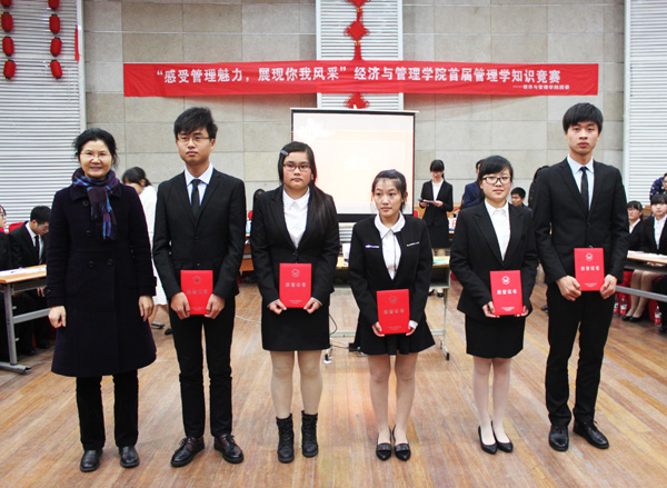 12月23日下午,经管学院以“感受管理魅力,展现你我风采”为主题的首届管理学知识竞赛在信息楼报告厅举行。经管学院院长刘莉、副院长李书进以及各系主任担任竞赛评委。