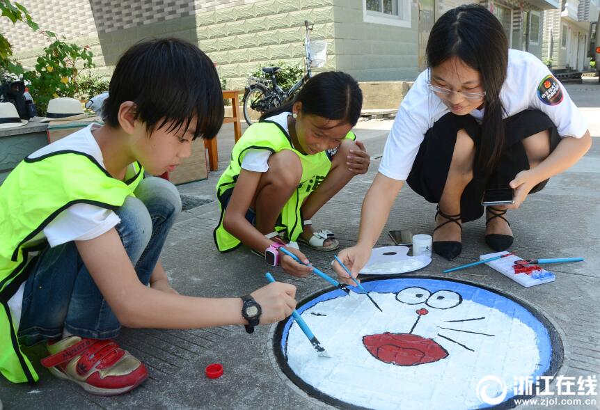 7月11日,大学生和“小候鸟”们在民居前后的窨井盖上彩绘,为美丽乡村添彩。