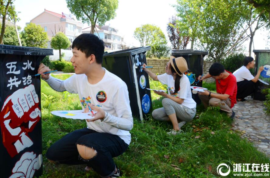 浙江在线7月12日讯(浙江在线拍友 郑莎 摄)7月11日,在温岭市滨海镇民益村的文化公园,镇团委组织宁波大红鹰学院信息工程学院的大学生在垃圾桶上作画,向村民倡导绿色环保生活。