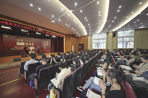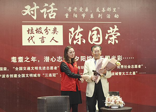 重阳节当天,学校还邀请了他们中耄耋之年,仍潜心志愿,致力于垃圾分类工作的“宁波垃圾分类代言人”——陈国荣老人走进校园,与300多名大学生共同对话人生。