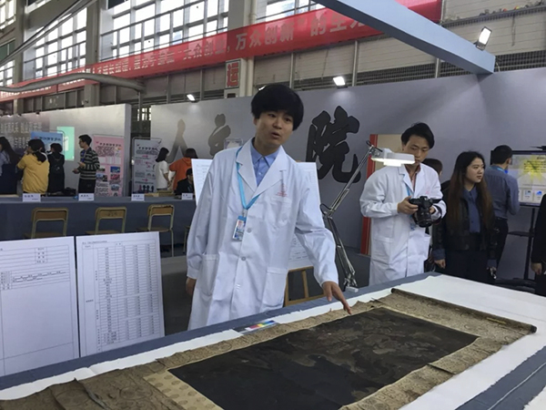 只见在学校的文化财产保护中心展区,工作人员正在修复一幅明初的古画。“这幅画是一位社会藏家委托我们修复的。这是一件名家作品,藏家从海外拍卖回来,但有一定的毁坏,于是送到了我们这里。”工作人员介绍说。根据作品毁损情况,他估计修复工作将持续两个月。据介绍,该中心还和西安一家科技公司合作,为文物保护提供技术支持,同时专家还进行现场鉴宝活动。