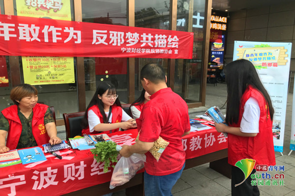 中国青年网宁波7月21日电(通讯员 柯凯迪)7月1日至8日,宁波财经学院反邪教实践团先后在宁波市江北区慈城镇,镇海区招宝山街道,海曙区月湖街道、南门街道和高桥镇,走乡村、入社区、进文化场地,携手乡镇、社区工作人员开展了以“新青年敢作为 反邪梦共描绘”为主题的反邪教宣传教育活动。活动目的是强化对广大市民的普法教育,增强社会大众“识邪、防邪、拒邪、反邪”的能力。