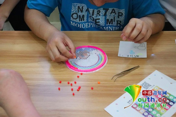 “趣味拼拼拼”是用拼豆材料按照图案进行拼接,完成后由成员们进行加工,变成精美的钥匙扣。图案有小汽车,KT猫,小熊猫,爱心等,天使们没有争抢的现象,按自己喜好坐下来安静的进行拼接。在他们拼接的时候成员们在一旁引导,发现“折翼天使”们的动手能力非常强,他们有的用镊子细心仔细地夹豆豆,有的用手一颗一颗地进行拼接,成功之后满脸笑容手舞足蹈,满满的自信在他们身上显现,他们还会向成员们撒娇,让成员们帮他们进行加工,获得钥匙扣。“折翼天使”们向成员们展示了他们的耐心与天才般的动手能力。
