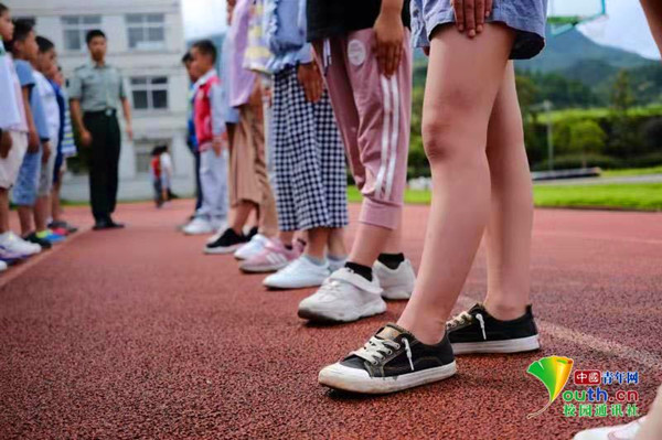 这是实践团来到村头镇以来第一次真切地见到村头镇湛蓝的天空,太阳也正式露了脸,作为军训活动的第一天,无论是实践团的成员还是孩子们都以最饱满的精神面貌对待这次军训。我们的军训活动教官由宁波财经学院军训教导队的成员们担任,教导队成员将在为期两天的时间里,将带领孩子们锻炼身体,学习军体拳以及为他们开展国防教育。下午的太阳和蝉鸣在夏天里带来燥热的气息,但是孩子们依旧最努力地保持军姿。虽然孩子们的脸颊上早已留下汗水,而他们喊出口号声却依旧那么的铿锵有力,他们笔挺的身影被傍晚斜晖照耀,落在操场的跑道上。军训进行的同时,实践团的成员们也在第一时间,为孩子们准备好防暑措施,时刻关注着孩子们的身体状况。