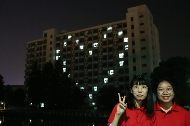 “这些图案看似简单,但真正操作起来却不那么容易,这些图案需要150余间寝室熄灯和亮灯的完美配合”17级学生祝秋锋是这次创意灯光秀的主创之一,为了这次灯光秀他前后忙活了好几天“主要是涉及的寝室较多,沟通协调和亮灯时间节点的把握。但大家都很配合,觉得能参与这样的活动十分有意义,更能表达对祖国的热爱。”