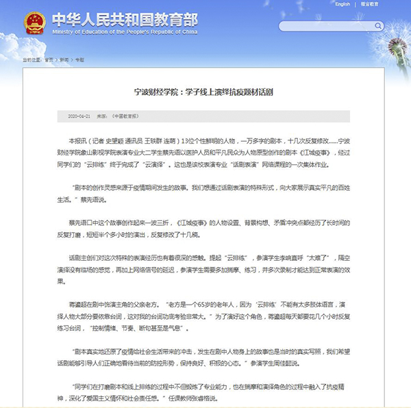 【教育部网站】宁波财经学院:学子线上演绎抗疫题材话剧