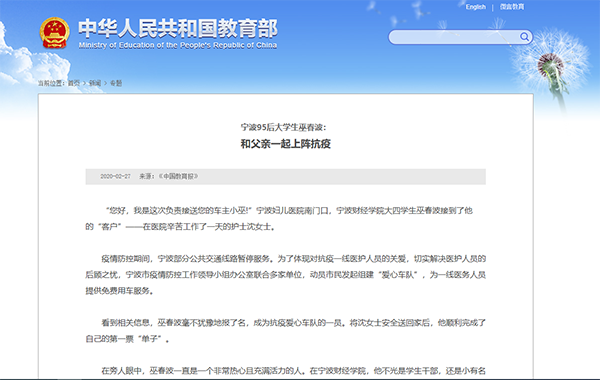 【教育部网站】宁波95后大学生巫春波:和父亲一起上阵抗疫