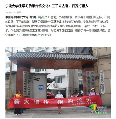 中国青年网景宁7月10日电(通讯员 叶莹莉)古老的畲族,传承着千年的白银记忆。不同的银器、不同的纹饰,赋予了银器制作工艺丰富多彩的文化内涵。宁波财经学院“魅力传承”暑期社会实践团在景宁县向畲族银器手艺人学习畲族银器锻制、造型、纹样工艺技术,体会到了银饰锻造工艺是对历史、对传统手艺的回顾,懂得了每一件银器的打造,都怀揣着匠人们执着传承传统文化的初心。
