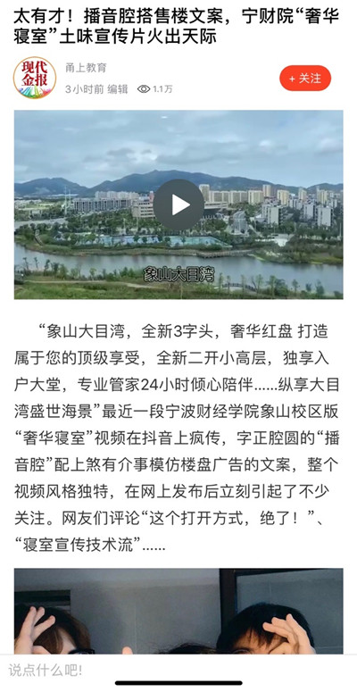 【甬上客户端】太有才!播音腔搭售楼文案,宁财院“奢华寝室”土味宣传片火出天际