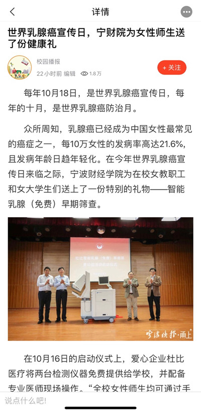 【甬上客户端】世界乳腺癌宣传日,宁财院为女性师生送了份健康礼