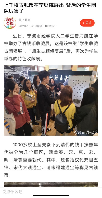 【甬上客户端】上千枚古钱币在宁财院展出 背后的学生团队厉害了