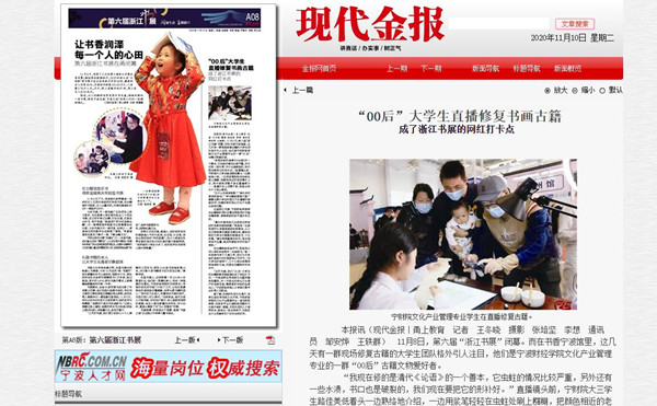 【现代金报】宁财院“00后”大学生直播修复书画古籍成了浙江书展的网红打卡点