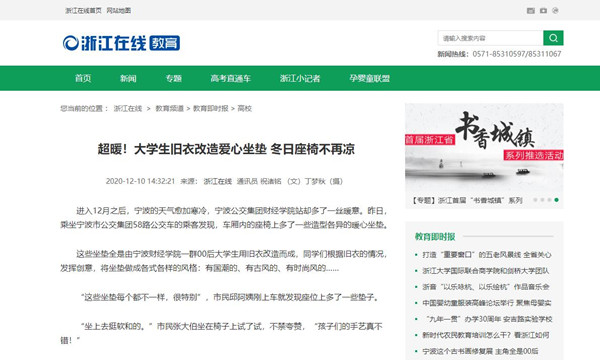 【浙江在线】超暖!宁波财经学院大学生旧衣改造爱心坐垫 冬日座椅不再凉