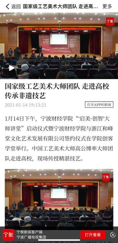 【宁波电视台宁聚客户端】国家级工艺美术大师团队走进宁波财经学院传承非遗技艺