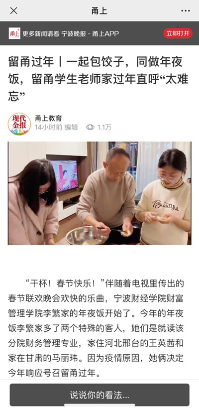 【宁波晚报甬上客户端】留甬过年丨一起包饺子,同做年夜饭,宁财院学生在老师家过年直呼“太难忘”