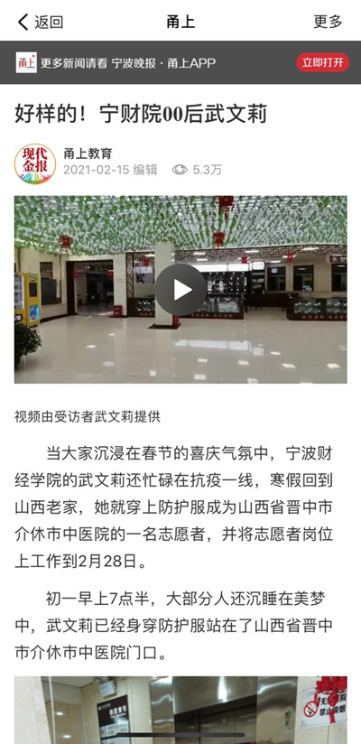 【宁波晚报甬上客户端】好样的!宁财院00后武文莉 寒假争做抗疫志愿者