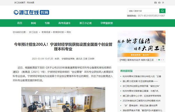 【浙江在线】宁波财经学院获批设置全国首个创业管理本科专业