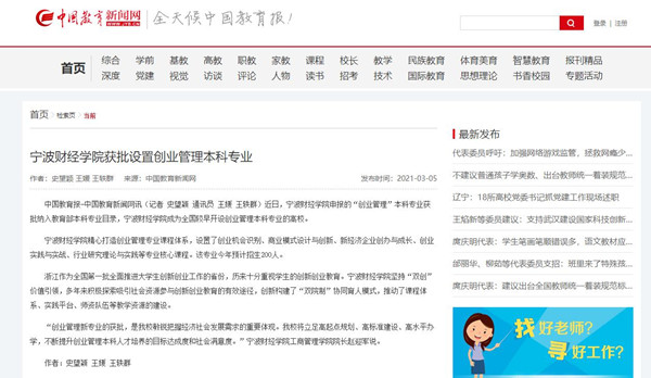 【中国教育新闻网】宁波财经学院获批设置创业管理本科专业
