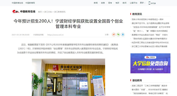 【中国教育在线】宁波财经学院获批设置全国首个创业管理本科专业