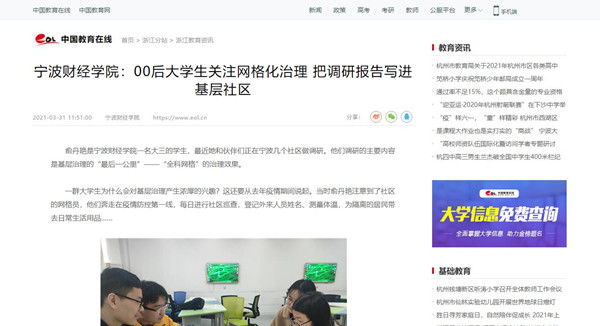 【中国教育在线】宁波财经学院:00后大学生关注网格化治理 把调研报告写进基层社区