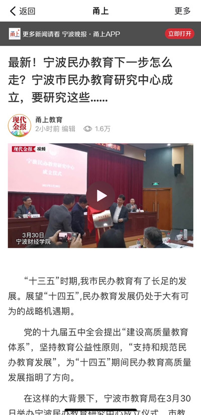 【甬上客户端】宁波市教育局与宁波财经学院共建的宁波市民办教育研究中心成立