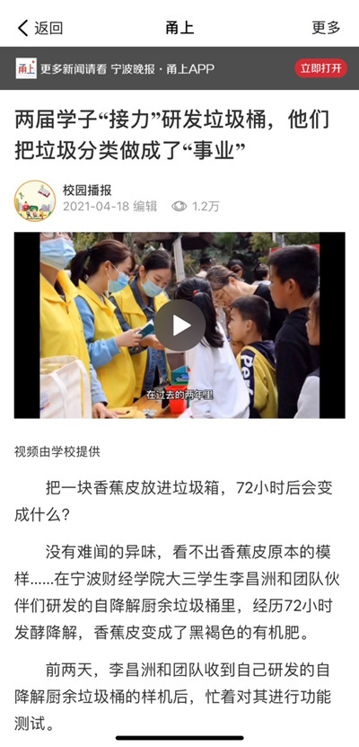 【宁波晚报甬上客户端】宁财院学子“接力”研发垃圾桶,他们把垃圾分类做成了“事业”