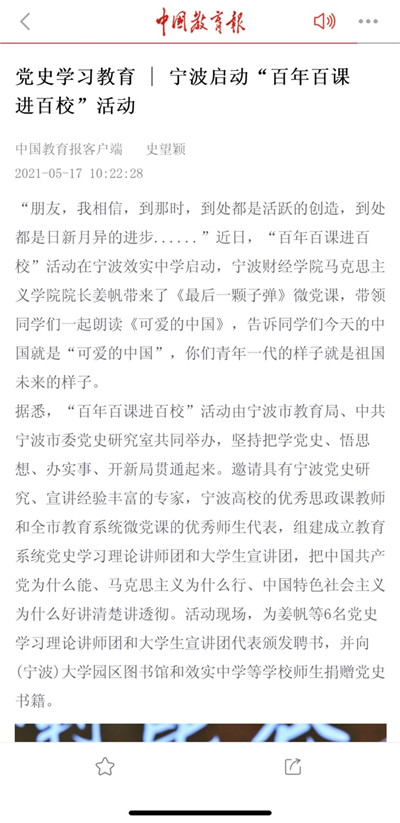 【中国教育报客户端】党史学习教育 | 宁波启动“百年百课进百校”活动 宁财院教师参与其中