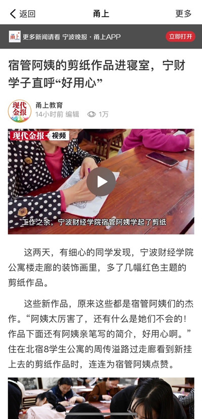 【宁波晚报甬上客户端】宿管阿姨的剪纸作品进寝室,宁财学子直呼“好用心”
