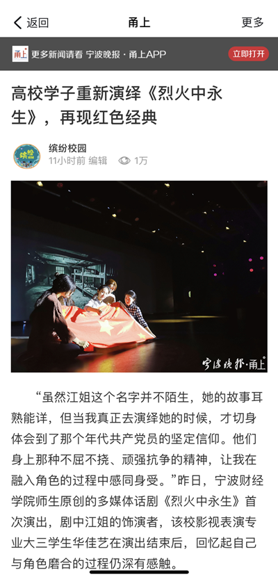 【宁波晚报甬上客户端】宁波财经学院学子重新演绎《烈火中永生》,再现红色经典