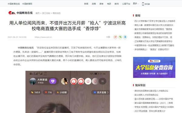 【中国教育在线】用人单位闻风而来,不惜开出万元月薪“抢人”宁波财院电商直播大赛的选手成“香饽饽”