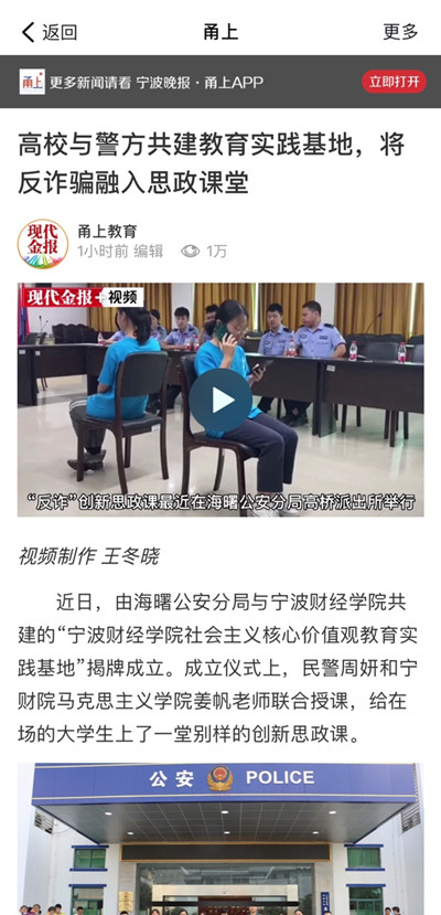 【宁波晚报甬上客户端】宁波财经学院与警方共建教育实践基地,将反诈骗融入思政课堂