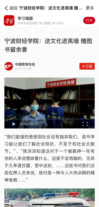 【学习强国】宁波财经学院:送文化进高墙 赠图书留余香