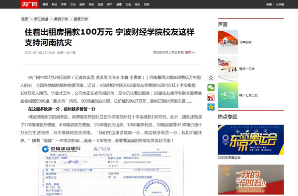 【央广网】住着出租房捐款100万元 宁波财经学院校友这样支持河南抗灾