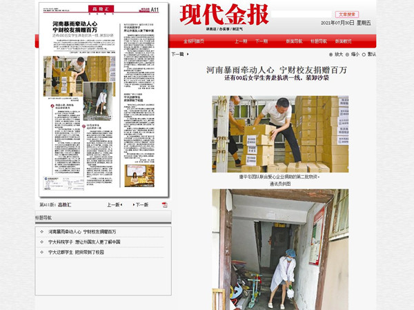 【现代金报】河南暴雨牵动人心 宁财校友捐赠百万