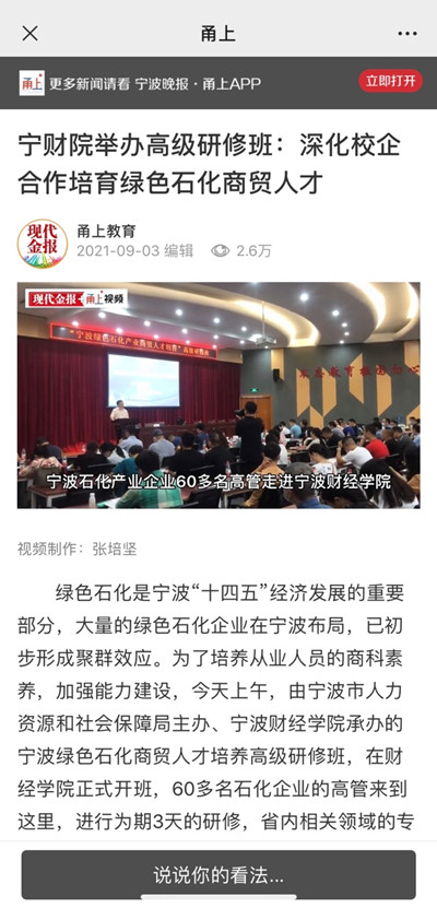 【宁波晚报甬上客户端】宁财院举办高级研修班:深化校企合作培育绿色石化商贸人才