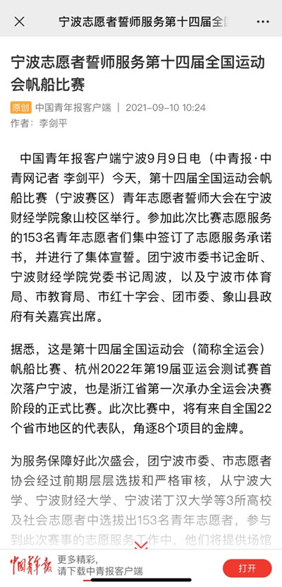 【中国青年报客户端】宁波财院志愿者誓师服务第十四届全国运动会帆船比赛