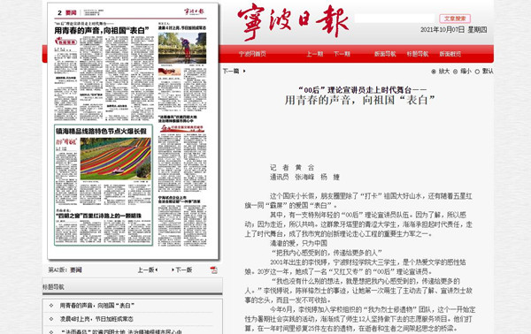 【宁波日报】宁财院“00后”理论宣讲员用青春的声音,向祖国“表白”